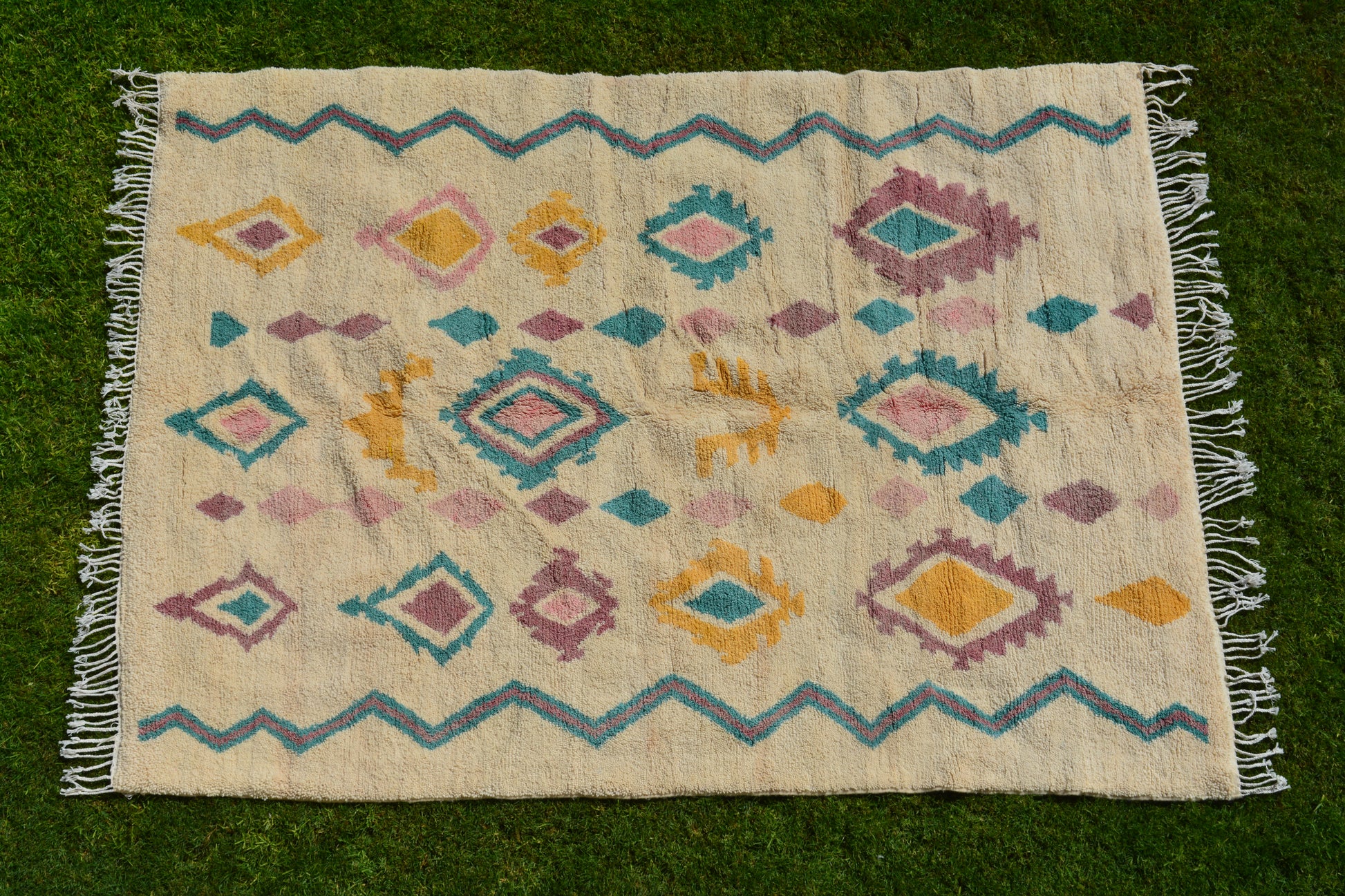 Tifawin means spring, the season of renewal when orchards bloom across the Atlas valleys. This rug features a natural ivory wool ground adorned with diamond and zigzag motifs in soft green, blush pink, and golden yellow, evoking blossoms, fertile soil, and gentle light. Its medium pile offers warmth and comfort, perfect for bedrooms or living areas. Each piece is handwoven and unique, crafted under fair-trade conditions, reflecting slow design and the timeless joy of Moroccan heritage