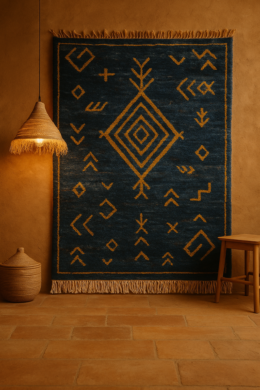 Tamayourt means starry night, when the Atlas sky reveals its constellations in luminous contrast. This rug features a deep indigo wool base illuminated by Amazigh symbols and diamond motifs woven in warm golden ochre, echoing stars scattered across the dark sky. The medium pile provides softness and presence, making it ideal for bedrooms, reading corners, or spaces of contemplation. Each rug is handwoven and one-of-a-kind, crafted under fair-trade conditions, embodying slow design and the timeless beauty of Moroccan heritage