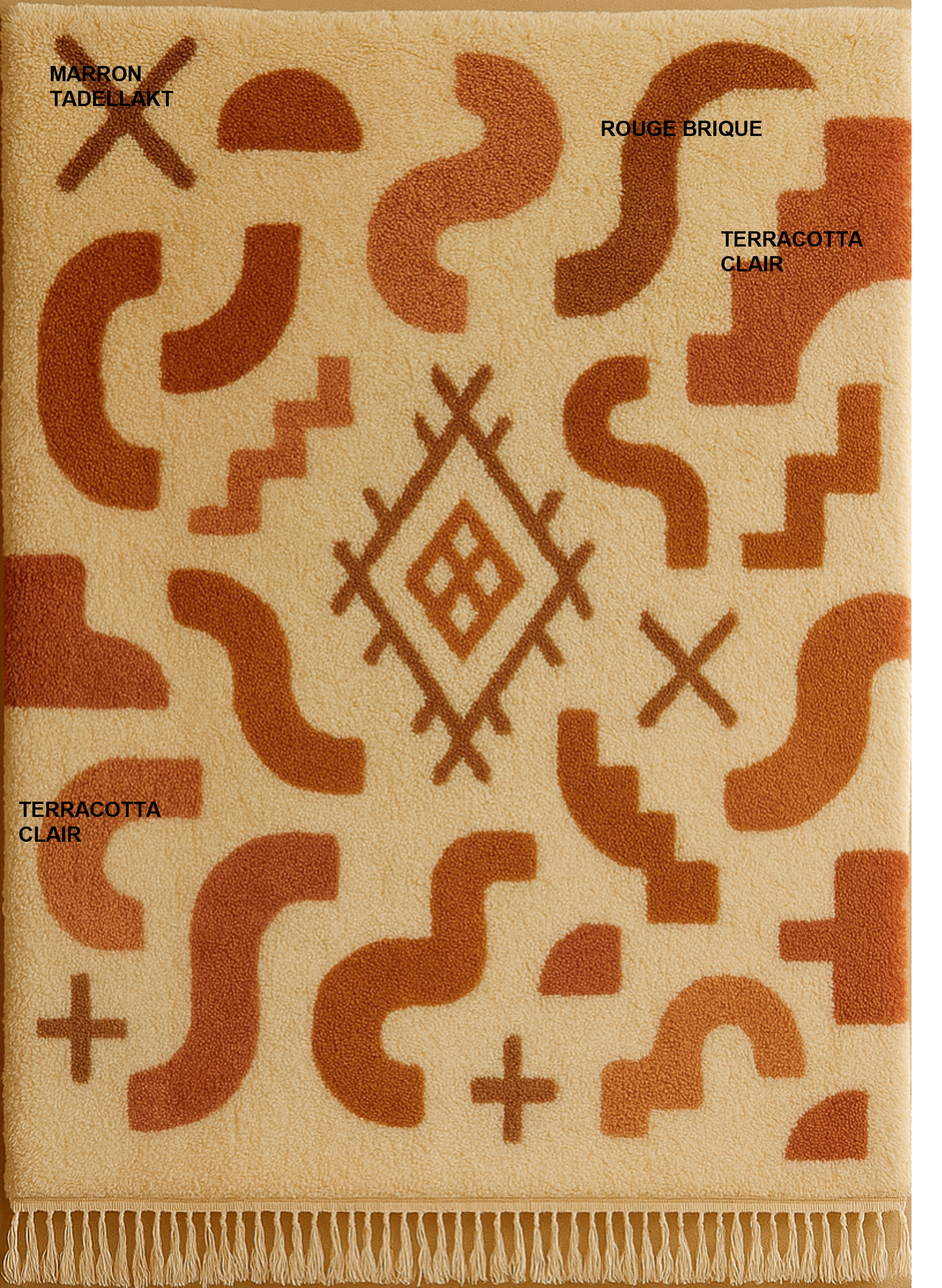 The rug reflects this architectural strength through its bold geometric motifs and its palette of light terracotta, brick red, and Tadellakt brown, directly inspired by the shades of sunlit rammed earth. Each color recalls a compacted layer of earth, each shape a protective wall.