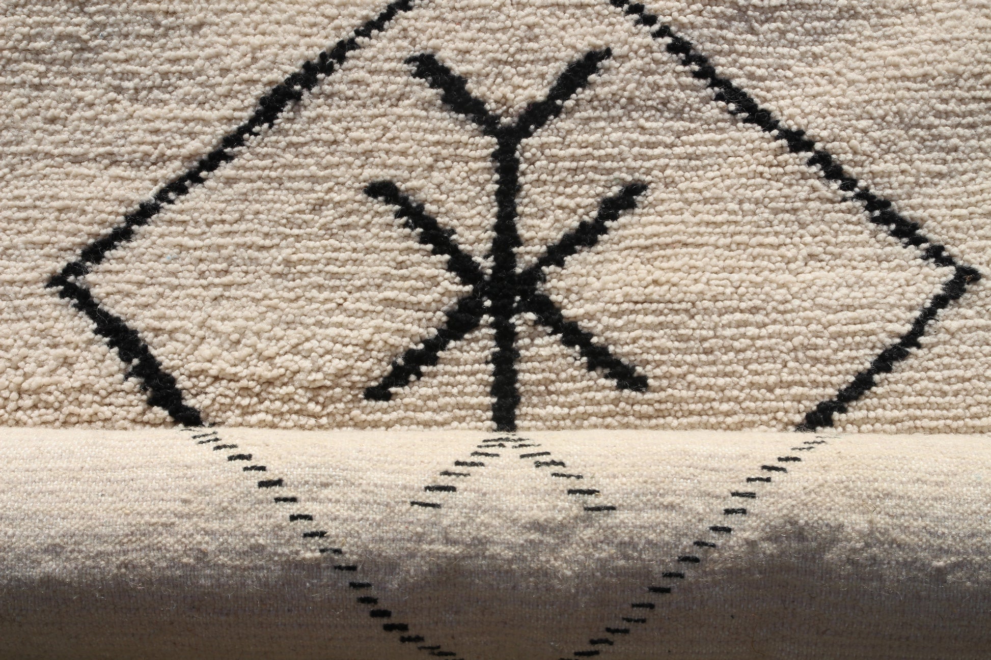 TIZI means mountain pass, the narrow yet vital paths that connect valleys and guide travelers through the Atlas. This rug features a natural ivory wool base with two bold central diamonds outlined in black, each framing an Amazigh symbol of identity and resilience. Zigzag borders along the sides echo the rugged contours of cliffs and winding trails. The design speaks of passage, protection, and the courage to cross from one horizon to another. Its medium pile provides warmth and durability, making it well suited for hallways, entryways, or spaces of transition within the home. Each rug is handwoven and one-of-a-kind, crafted under fair-trade conditions, embodying slow design and the enduring rhythm of journeys through Moroccan mountains